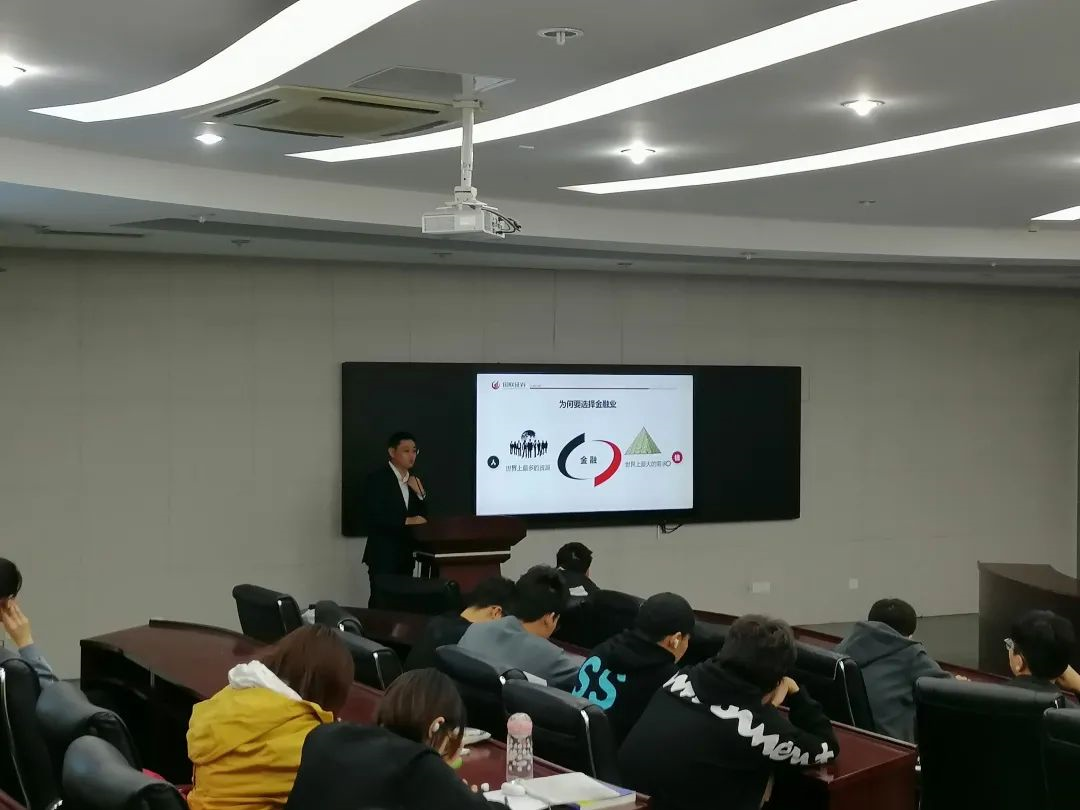 陈老师通过鲜活的事例以及详细的讲解,让同学们对了解金融行业和获取金融知识的兴趣大大提高。于此,陈老师提出了为何选择金融业,并强调了在金融行业中,人是世界上最多的资源,钱是世界上最大的需求,而金融行业正是因为能满足人们的这些需求,所以广受欢迎!