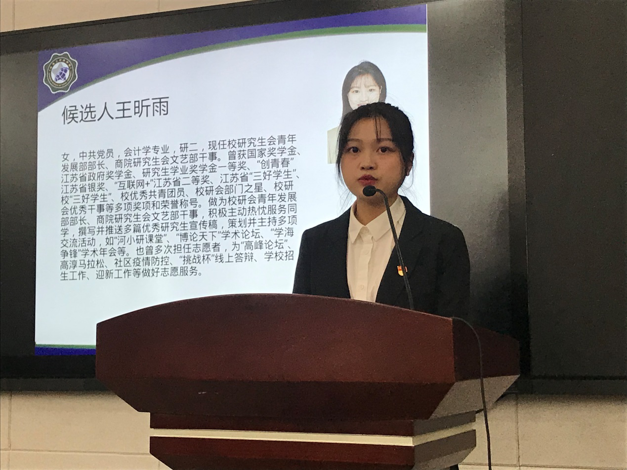 校研会代表杨一帆同学代表校研究生会发表讲话。她指出,永利集团304am登录研究生会的各项工作都交出了满意的答卷,在思想引领、学术科研、社会实践等多个方面取得了优异的工作成绩。同时,她希望永利集团304am登录研究生会紧跟时代步伐,进一步加强组织建设,不断创新工作思路,着力提高服务水平,努力开创研究生会工作的新局面。