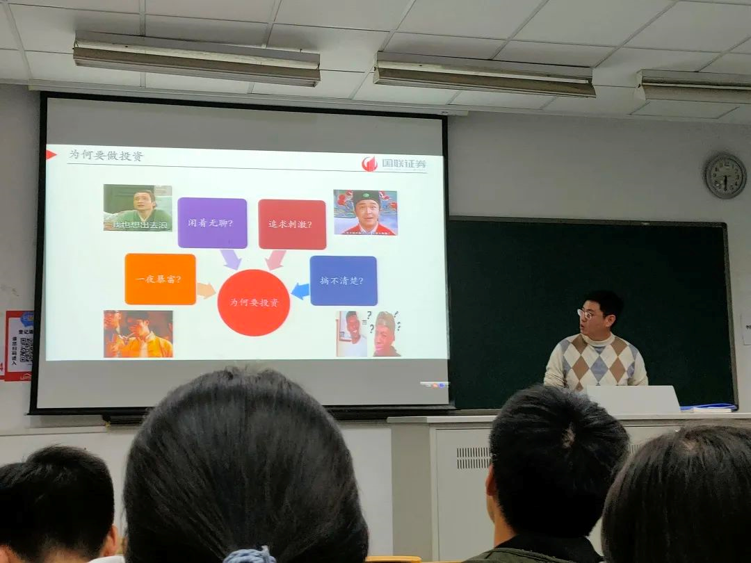 讲座开始,陈老师首先向同学们提出了“为何要投资”这个问题,并举出了“锻炼专业素养”、“增加个人收入”等原因,帮助同学们打开了思路。同时,陈老师的课件加入了网络流行语和经典影视形象等内容,使得严肃刻板的讲座变得幽默亲切。