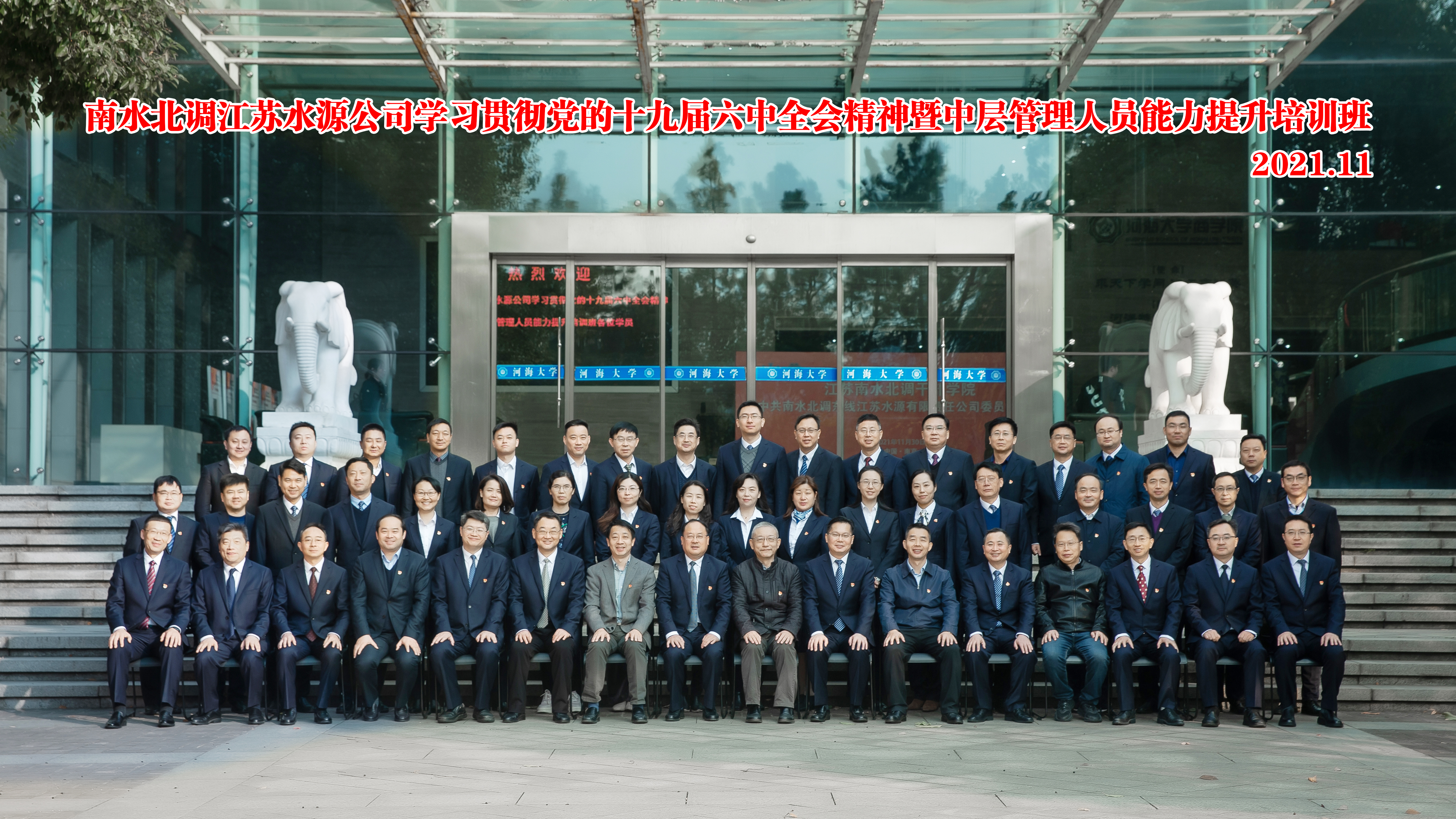 揭牌仪式上,袁连冲总经理宣读了江苏南水北调干部学院成立文件,周海炜院长与南水北调江苏水源公司党委副书记李松柏签订了合作协议,荣迎春董事长和张兵副校长共同为江苏南水北调干部学院(江苏水源公司党校)揭牌。随后,张兵副校长为“学习贯彻党的十九届六中全会精神暨中层管理人员能力提升培训班”授旗并讲话。他介绍了永利集团304am登录的历史沿革、办学特色以及永利集团304am登录的办学成效,希望通过本次联合共建“江苏南水北调干部学院”,推动双方在相关领域进行“全方位、深层次、多角度、大平台”合作,真正成为校企合作的典范。荣迎春董事长介绍了成立党校的初衷,并指出学院未来发展将坚持“学院姓党”根本原则,坚持“南水北调”专属特色,坚持“水源熔炉”主要职能,努力把学院建设好!
