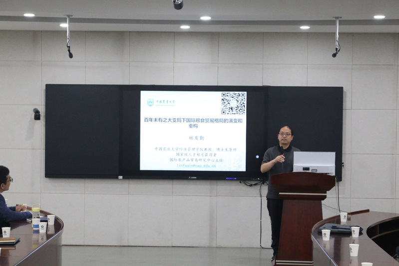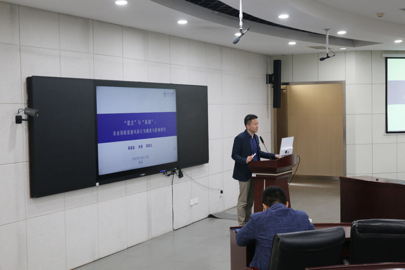 易福金教授以“‘谎言’与‘真相’:农业保险道德风险行为测度与影响研究”为主题,介绍了如何对农业保险道德风险进行测度,探寻了其对农业投保的影响,从农业保险、中国政策性农业保险和农户道德风险三方面分析了相关研究背景,详细阐述理论模型和实证分析过程,呈现了实证结果,最后给出了相关研究结论和政策建议。林发勤教授以“百年未有之大变局下国际粮食贸易格局的演变和重构”为题,将国际粮食贸易作为切入点,深入探讨俄乌冲突以及中美贸易摩擦对中国粮食安全及粮食价格的影响,剖析我国农产品贸易面临的新时代特征,包括逆差逐年扩大、进口过于集中、进口结构巨变以及产品比较优势降低等问题。林发勤教授还就农产品贸易政策建议等内容,与师生们进行了深入的探讨和交流。