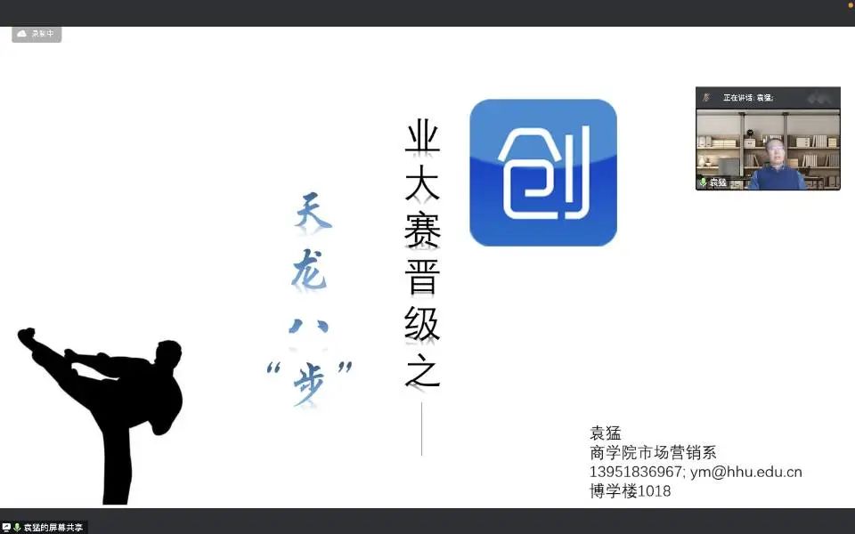 讲座开始,袁猛老师先分享了自己指导竞赛的经历和经验,幽默地将此次讲座的内容概括为创业大赛晋级的“天龙八步”。他指出,要想参与并在创新创业赛事中成功晋级,首先要做好第一步——“战斗准备”。知识准备不可或缺,除此之外,袁猛老师还强调了心理准备的重要性,创新创业大赛通常涉及广,战线长,需要长久地付出极大的精力与努力,只有做好心理准备,才有打赢比赛的机会。
