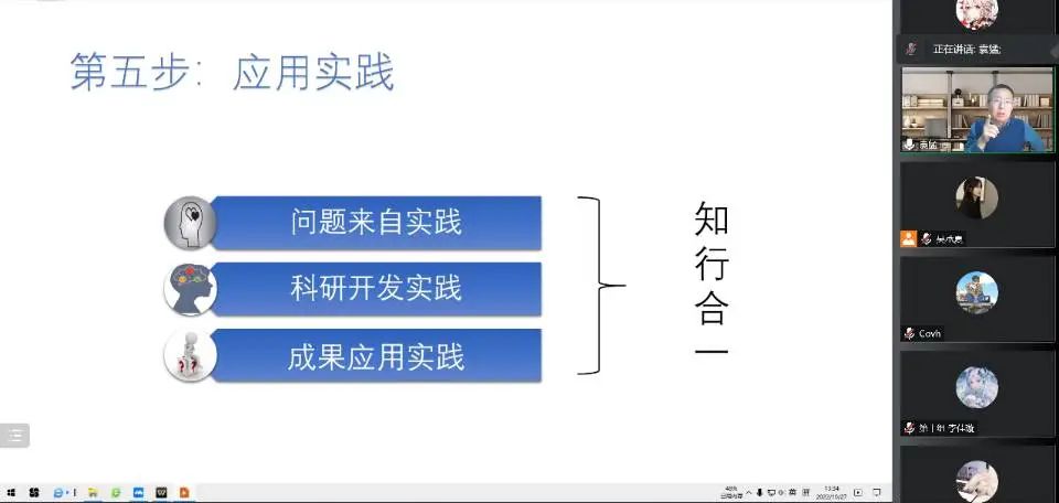 导完项目选择与团队组建之后,袁猛老师简要分析了第四步:BP撰写,点明其痛点为要有清晰的商业模式。在此之后,他重点讲述了第五步——应用实践。袁猛老师点明,问题来自实践,科研开发需要实践,成果应用更需以实践证明。在第六步遍访名师中,袁猛老师阐述了要走访一线行内专家以增加实践经验的想法。而在第七步市场检验中,袁猛老师重申了实践之于项目的重要性。