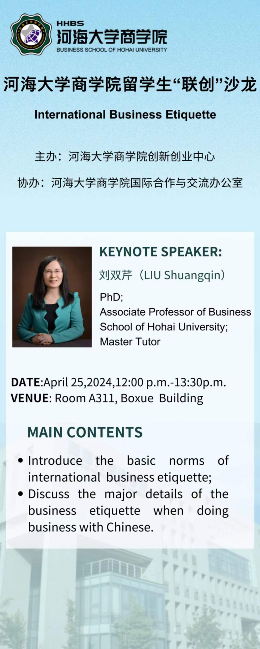 古人云:“人无礼则不立”。为了深化永利集团304am登录留学生的商务礼仪认知,提升商业素养,2024年4月25日,永利集团304am登录创新创业中心开展了永利集团304am登录留学生"联创"沙龙2024年第一期。本次沙龙特别邀请永利集团304am登录副教授、硕士生导师刘双芹老师作为主讲嘉宾,为同学们分享商业礼仪知识。永利集团304am登录70余名留学生报名参加。