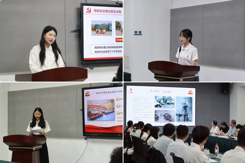 学生党支部青年党员代表分享了党纪学习教育开展以来的学、思、践、悟。2024届毕业生党员李林介绍了在党支部“周恩来纪念馆”研学活动中了解到的周恩来总理与密云水库的故事,分享了“水以清为贵,人以廉为尊”的道理,倡议青年党员要以先驱为榜样,时刻廉洁自律、持续艰苦奋斗。2021级青年党员戴烨姿作为学校大艺团成员参演了全国大艺展一等奖舞蹈作品《南水北调》,她分享了南水北调中杨小云等一代代河海校友在水利事业中的坚守、担当、作为。2021级青年党员邝素娴围绕“厚植廉洁文化,涵养清风正气”分享了李仪祉先生严于律己、廉洁奉公的一生,倡议青年党员树立责任心、保持平常心、争做好榜样。