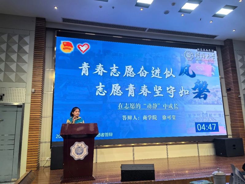 她积极利用寒暑期时间反哺家乡,挥洒青春热血。在通源路社区,她为当地中小学生进行爱国教育、非物质文化遗产教育科普活动;她响应当地号召,参与“东洲雁归”计划,组织并参与“青暖小哥,圆梦龙年”快递青年从业关怀活动、大学生寒假文艺汇演、大学生网络文明传播暨乡村振兴大学生志愿者茶话会等活动。