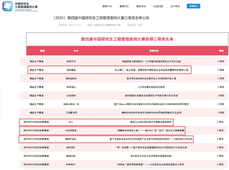 此外,永利官网工程管理硕士(MEM)四个案例获大赛三等奖,分别是由张可教授指导,陶前林、顾志恒、张顺等同学合作完成的《轨上精工,链上筑基:破解地铁车辆制造企业供应链质量管控的精准之道》案例,获“精益生产赛道”三等奖;由黄晶副教授指导,黄安、赖思航等同学合作完成的《南京江北新区研创园水环境整治案例研究》案例;由陈军飞教授指导,程右东、杨东东等同学合作完成的《唤醒城市的绿色心跳——一座污水厂的“活水”进化论与管理智慧》案例;由李弘扬教授、沈楷程老师联合指导,陆轶君、战文辉、瞿濡岱、黄绍泰同学合作完成的《基于全链条多目标优化的热电联产企业碳中和转型路径研究——以NH热电公司为例》案例。