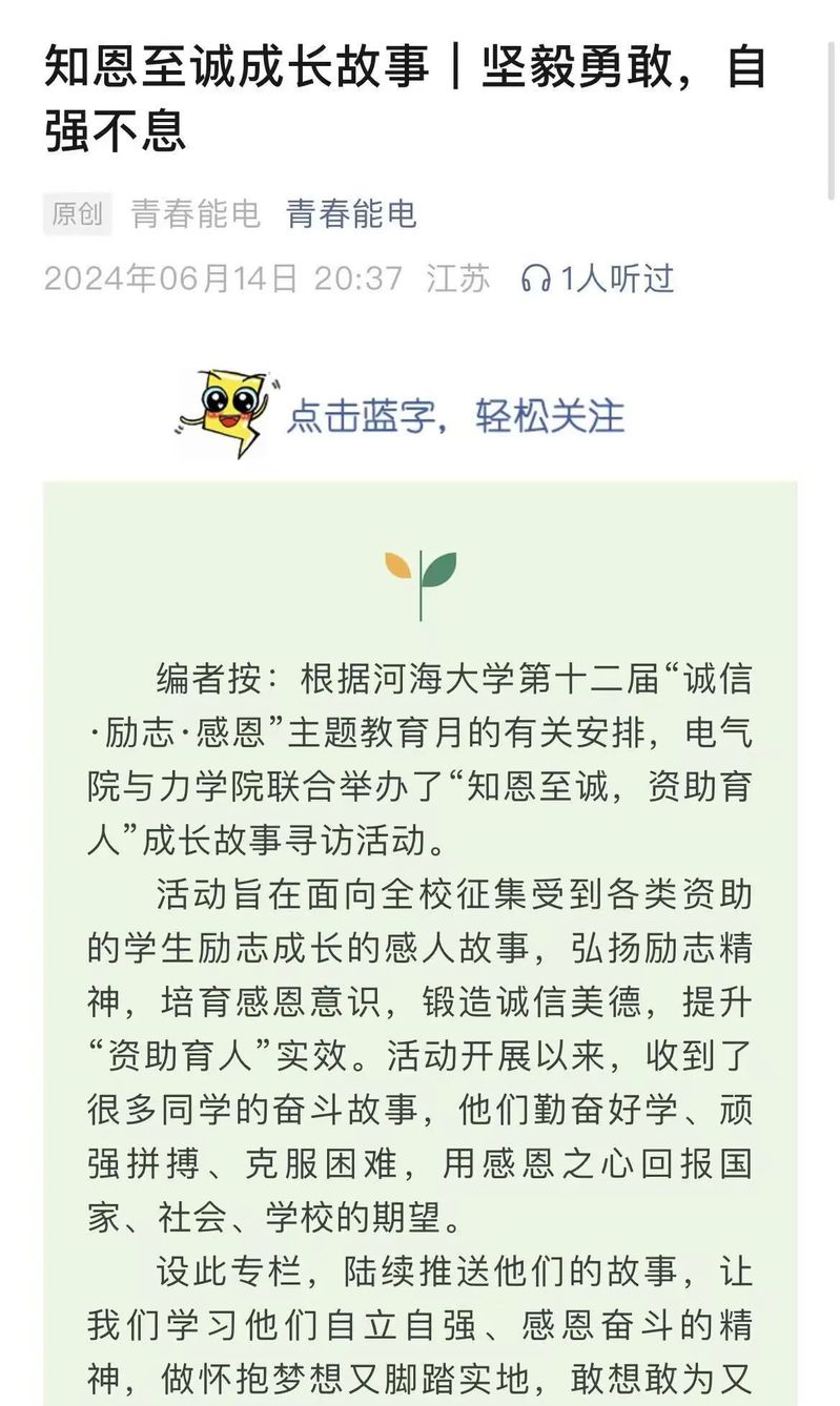 张金亿来自于农村困难家庭,她在国家、社会与学校的爱心与关怀下一路成长,是国家的资助育人政策助力她从义务教育阶段一路走到大学校园,感恩的种子早早在她心中播种。进入大学之后,她先后成为学校“青马工程”学员、“1442工程”学员、院学生会主席、年级团总支辅导员助理、学生工作处助管等,拥有校、院多级平台的“n”重身份,在丰富、扎实的学生工作中汲取养分,向上生长,并立志回馈。她不断了解多重资助政策,参与学校“以诚信感恩为翼,展青春励志之姿”征文比赛,真诚发表自己关于资助政策与成长之路的感想。同时,她也积极参与红色精神相关活动,加入团中央全国大学生遵义会议精神志愿宣讲团队、跟随学院红色水利团队开展调研,深入一线了解基层政策,不断沉淀自己的“红”色感恩心,也在心底深深扎下自己的“助梦根”。